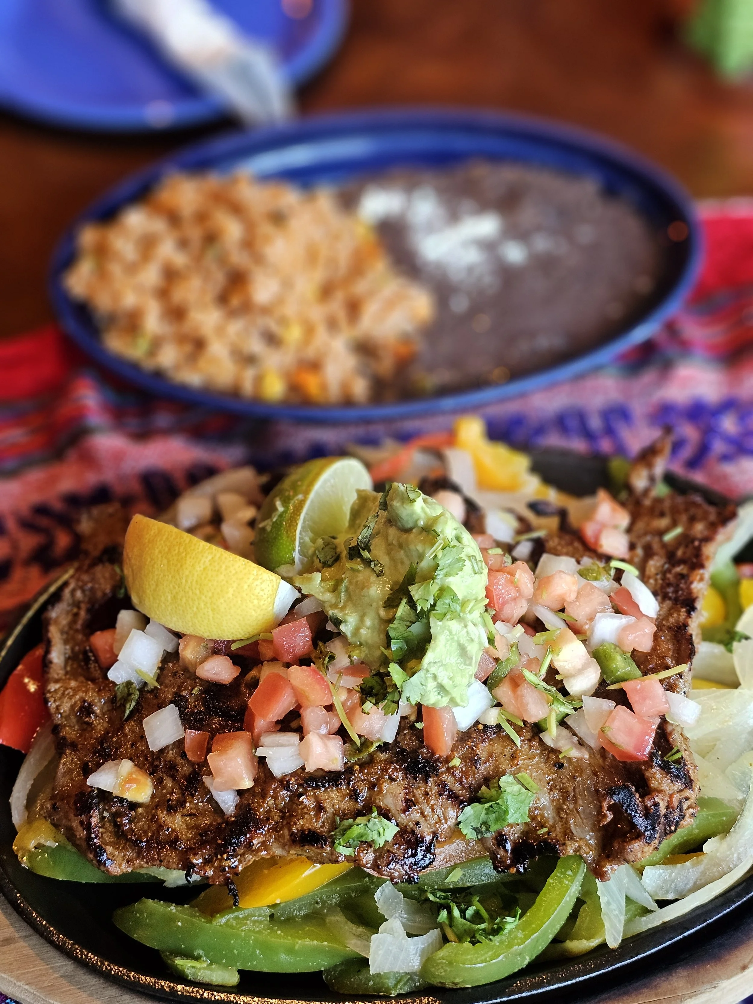 Blackened Char-Grilled Flank Steak Fajita, Bell Peppers and Onions, Pico de Gallo, Guacamole, Flour Tortillas, Rice & Beans